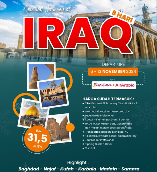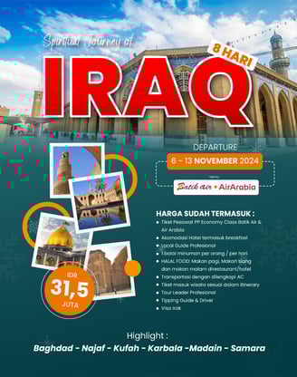 Nikmati kekayaan sejarah dan spiritualitas sambil mengagumi keindahan arsitektur dan budaya Irak. Perjalanan ini mengajak Anda menjelajahi Irak, mengunjungi makam sahabat Nabi dan imam suci, serta situs arkeologis kuno.