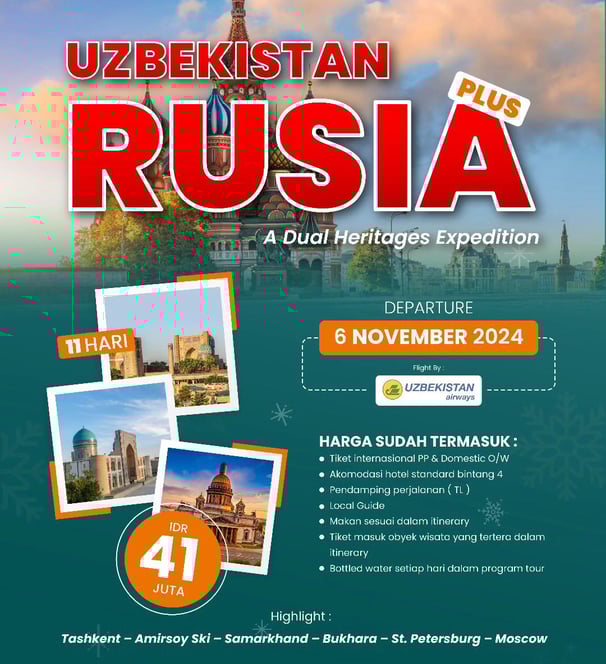 Perjalanan menjelajahi Rusia dan Uzbekistan. Wisata budaya dan sejarah termasuk kunjungan ke masjid, katedral, museum, serta menikmati alam pegunungan di Tashkent dan Samarkand sebelum kembali ke Jakarta.